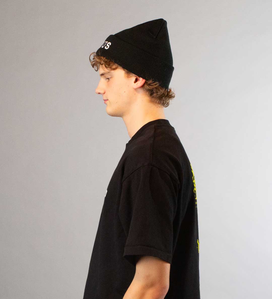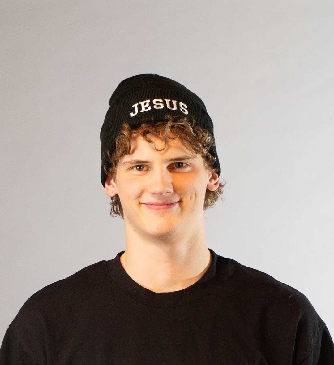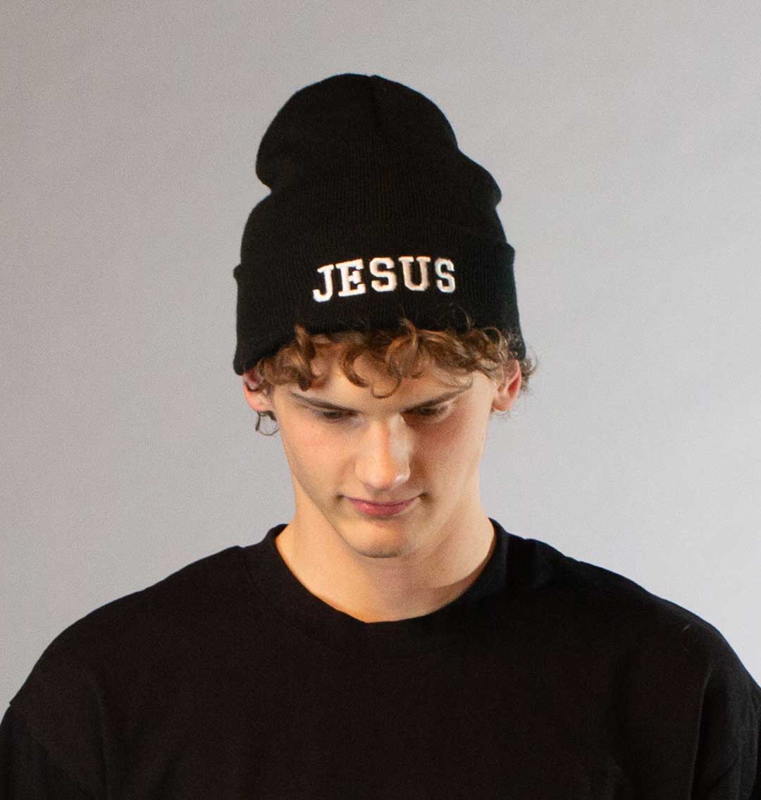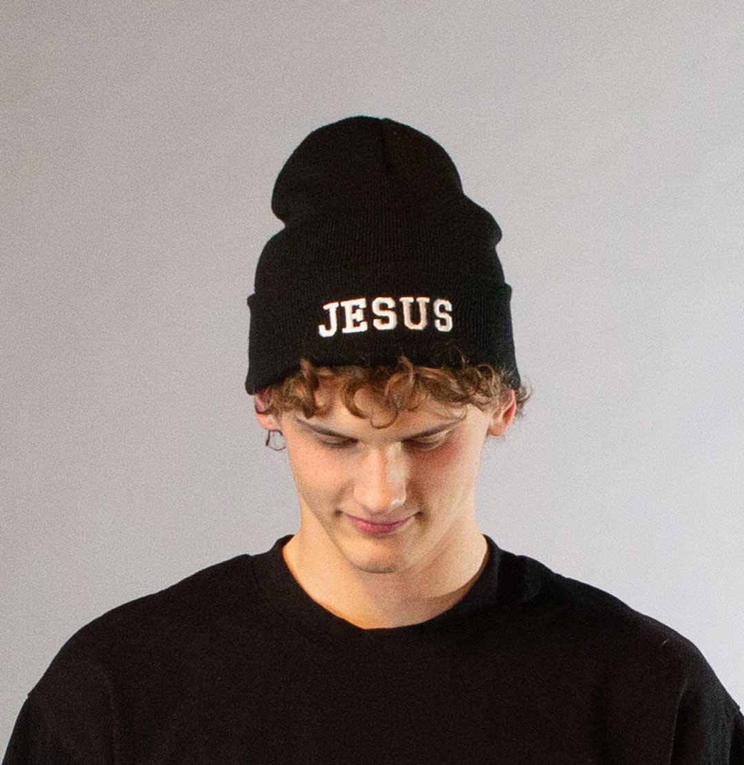 Black beanie with “Jesus” embroidered.